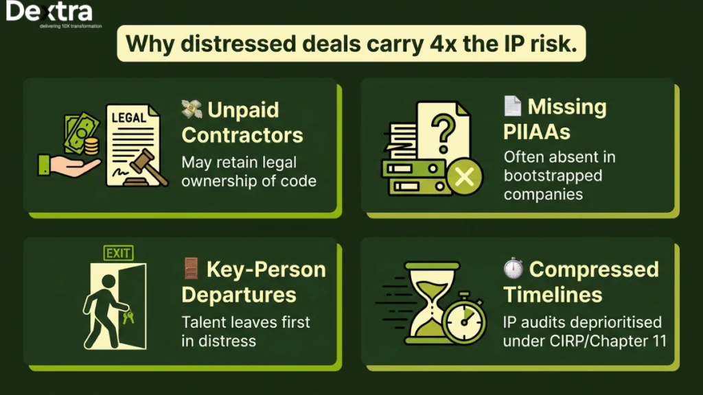 This isn’t hypothetical. IP ownership failures are one of the most frequent and most expensive, surprises in distressed tech acquisitions. Whether the target sits in Bangalore, London, Singapore, Dubai, or San Francisco, the underlying problem is structural: when companies enter financial distress, the first things to break down are documentation, compliance processes and contractor relationships. The very systems that prove IP ownership stop being maintained long before the asset hits the market.