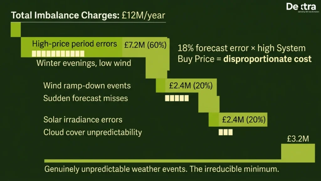 Imbalance charges dropped from £12M to £3.2M in the first year. The remaining £3.2M represents genuinely unpredictable weather events (sudden wind ramp-downs, fog events) where no forecasting system can eliminate error entirely.