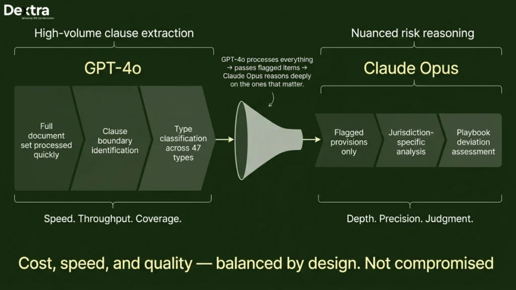 At Dextralabs, we used a dual-model architecture. GPT-4o handles the high-volume clause extraction work where speed matters, it processes the entire document set quickly and identifies clause boundaries and types. Claude Opus handles the nuanced risk reasoning on flagged provisions, where analytical depth matters more than throughput. This split lets us balance cost, speed and quality.